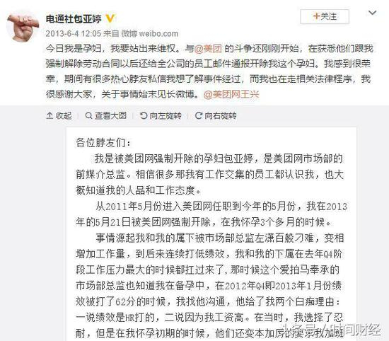 同样在2011年入职美团的包亚婷曾任职PR总监,因为孕期被离职事件与美团对簿公堂,最终以美团网赔偿后双方解除劳动合同。但彼时并未涉及到期权问题。