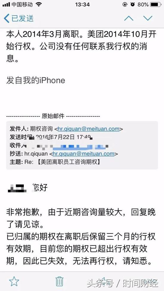 曾任美团徐州站销售主管的余海告诉时间财经,他在离职后向美团咨询期权问题时被告知,公司曾邮件发送到他的工作邮箱通知行权,如今有效期已过。因为离职后工作邮箱已经注销,余海要求对方拿住已发送通知行权邮件的证据,但对方未予理睬。