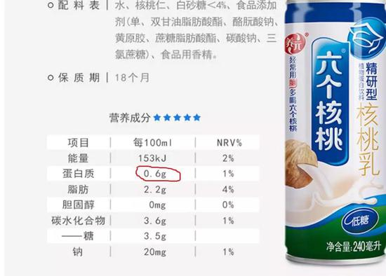 然而,“六个核桃”成分表显示,100毫升里蛋白质含量为0.6克,脂肪含量为2.0克。那么,一罐240毫升的“六个核桃”,其蛋白质、脂肪含量分别为1.44克、4.8克。