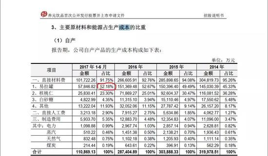养元饮品招股说明书提供的数据显示,2017年上半年,其自产产品的生产成本主要分为直接材料费、直接人工费和制造费用,占比各为91.75%、2.9%和5.35%,合计100%;
