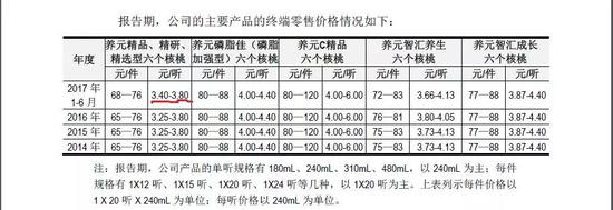 养元饮品招股说明书提供的数据显示,2014年、2015年、2016年和2017年上半年,养元精品、精研、精选型六个核桃分别约为65-76元/件、65-76元/件、65-76元/件和68-76元/件,3.25-3.8元/听、3.25-3.8元/听、3.25-3.8元/听和3.4-3.8元/听。