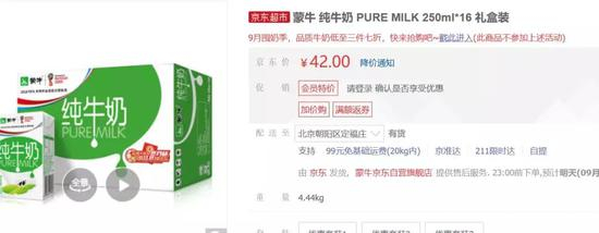 蒙牛乳业旗下纯牛奶250毫升平均每盒价格则在2.625元左右。