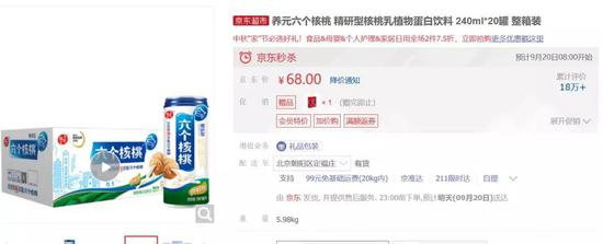 9月19日,在京东商城上,养元精研六个核桃240ml*20罐一箱(件)标价68元,折合成每罐(听)约为3.4元;