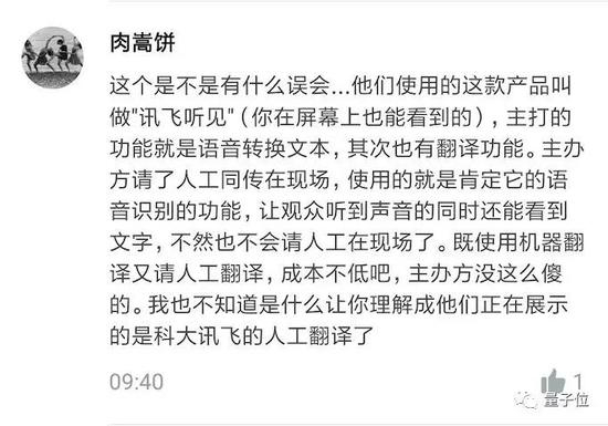 Bell同学声明,科大讯飞事前没有告知他和搭档会场有语音识别的字幕,也没有告诉他们直播的同传是机器朗读二人翻译文稿,没有征得二人同意就冒名使用了他们的翻译成果,有侵犯知识产权的嫌疑。