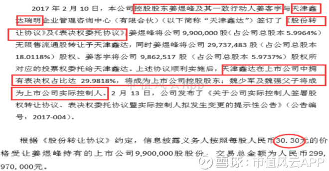 2017年2月10日,公司控股股东姜煜峰及其一致行动人姜客宇与交易对方天津鑫达签订了《股份转让协议》及《表决权委托协议》,将公司的股权及对应的投票权均委托给天津鑫达行使,其中990万股的股权转让价为30.3元/股,较停牌价溢价23%,转让总价为2.99亿。最终天津鑫达持有上市公司5.9964%的股份,以及23.9854%股份对应的表决权。天津鑫达成为公司的控股股东,魏少军及魏强父子成为公司实际控制人。