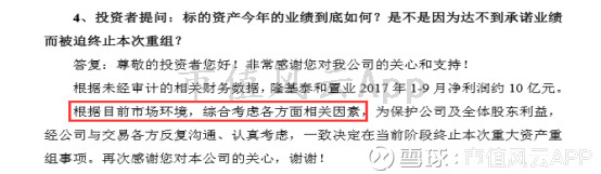 关于重组流产,公司在2017年12月30日召开了投资者说明会,给出的解释是综合市场环境、各方面因素考虑,双方一致决定的终止重组。