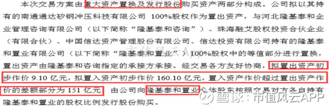 公告称,公司将置出盈利能力较弱的电动机、发电机定转子冲片和铁芯业务,100%置入盈利能力较强的地产产业业务,实现主营业务的整体转型。该项资产置换,置出资产作价9.1亿,置入资产作价160.1亿。剩余的151亿由上市公司以发行股份的方式进行收购,收购完成后,隆基泰和将实现借壳上市。