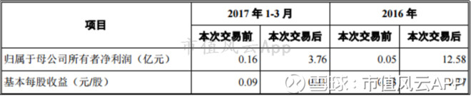 而且,备考财务报表显示,一旦交易完成,上市公司2016年的归母净利润将由0.05亿上升为12.58亿,基本每股收益由0.03元/股上升为1.37元/股;2017年1-3月的归母净利润由0.16亿上升为3.76亿,基本每股收益也将从0.09元/股提高至0.41元/股。盈利能力将显著提升。