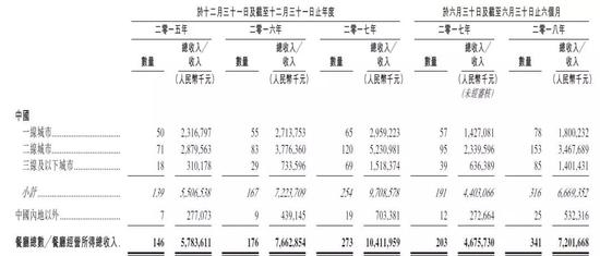 看看2017年的分布。一线城市门店数量65家,营业收入29.59亿元;二线城市门店120家,营收收入52.3亿元;三线及以下城市门店数量69家,营业收入15.18亿元。海外门店营收为7亿元。
