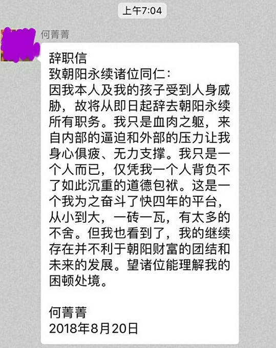 记者向朝阳永续集团(下称“朝阳永续”)董事长廖冰求证何菁菁的离职情况,廖冰表示其离职申请并未通过。