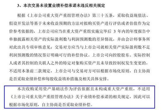 而公司的答复,却是此次交易未构成重大资产重组,因而不适用《办法》中关于业绩补偿承诺的相关规定,因而不采用业绩补偿。