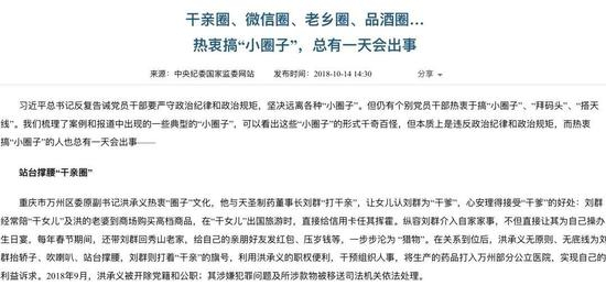 10月14日,中央纪委国家监委网站发布题为《干亲圈、微信圈、老乡圈、品酒圈…热衷搞“小圈子”,总有一天会出事》的文章,对通过各类圈子受贿行贿的行为进行了披露。
