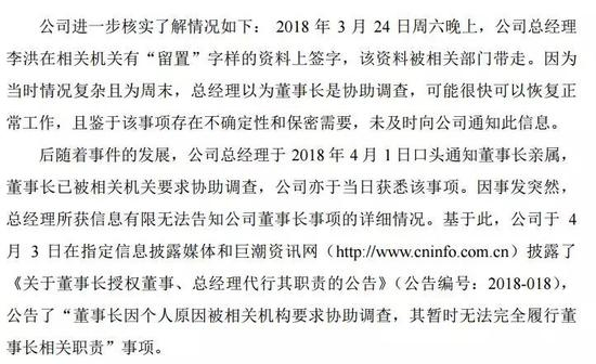 今年4月3日午间,天圣制药爆出第一个雷,公司于2018年4月1日从其亲属处获悉,董事长因个人原因被相关机构要求协助调查,暂时无法完全履行董事长相关职责,公司于当日从其亲属处取得董事长委托公司董事、总经理李洪女士代表其履行职责的授权委托书。