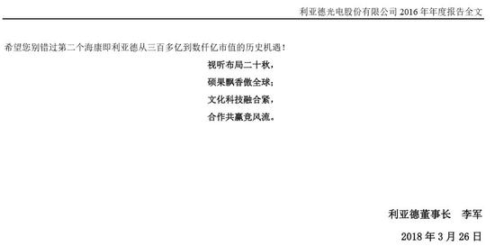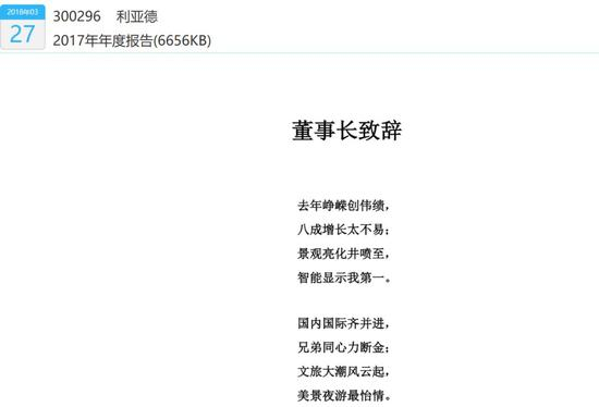 写出如此让市场轰动的“兜底申明”,反映李军董事长很有个性、很诗性。梧桐君看了一下公司2017年年报,年报首页就是董事长致辞,而且这个致辞的开始和结尾都是诗!