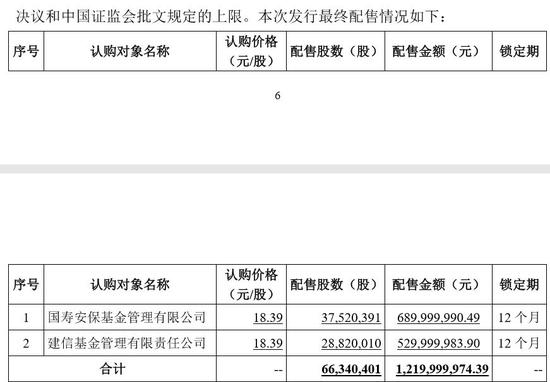 公司在2018年1月完成了一次非公开发行。国寿安保基金管理公司、建信基金管理公司这2 名特定投资者认购股票 6634.0401 万股,发行价格为 18.39 元/股,募集资金总额 12.19999亿元。该部分股票2018年2月7日上市,限售期12个月。