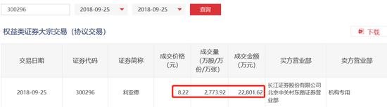 9月25日通过大宗交易卖掉股票,是按什么价格卖的?梧桐君查到深交所公布的资料,当天利亚德只有一笔大宗交易,成交股票数量2773.92万股,刚好与员工持股计划数量一致,成交价格8.22元/股,成交金额22801.62万元。