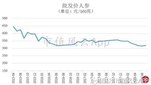 风云君从WIND中导出人参从2015年3月至今的价格趋势图,数据显示人参价格2015年来处于价格下降通道,价格从2015年3月的443.13元/500克一直跌到2018年7月的318.89元/500克。