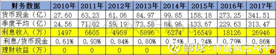 康美药业2015年-2017年账上分别有158亿、273亿、341亿的货币现金,四个季度平均现金额为133亿、229亿、313亿,然而利息收入只有1.65亿、1.81亿、2.69亿,利息/季度平均现金比例为1.24%、0.79%、0.86%。
