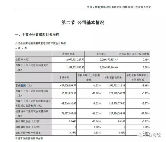 报告显示,2018年第三季度,全聚德经营活动产生的现金流量净额约为0.72亿元,同比减少41.52%;