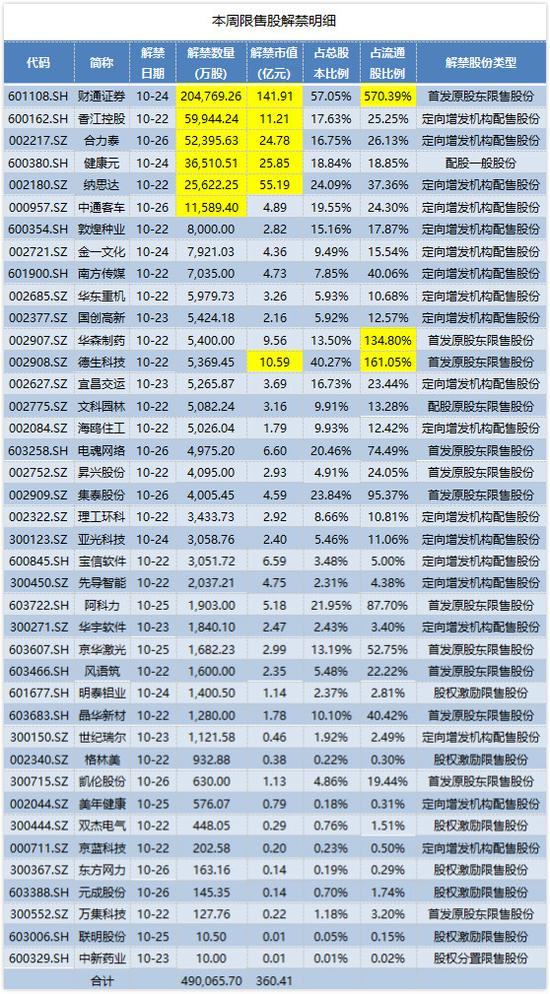 Wind数据统计显示,10月22日-26日共有40家公司合计49.01亿股上市流通,以10月19日收盘价计算(下同),解禁市值360.41亿元。财通证券(601108.SH)一家解禁市值就超过了140亿元,占本周解禁规模的近四成。