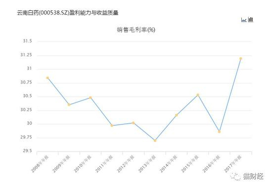 与此同时,云南白药的销售净利率也在2013年达到14.68%的高峰后,略为微微降低,整体维持在12%~14%之间。而对其销售毛利率而言,十年间的整体变化不算太大,基本稳定在30.25%左右。