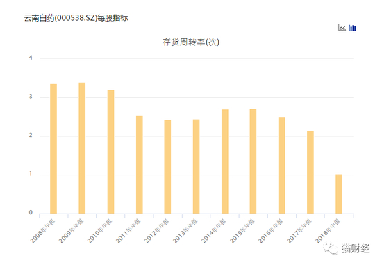 面对增速如此强悍的库存,云南白药的消化能力怎样?如下图,云南白药2008年至2018年上半年,其存货周转率整体呈下降趋势(备注:2018年上半年,云南白药的库存周转率为1.02次,若按全年来计算,约在2.04次左右,与2017年的2.17次相比略低)。