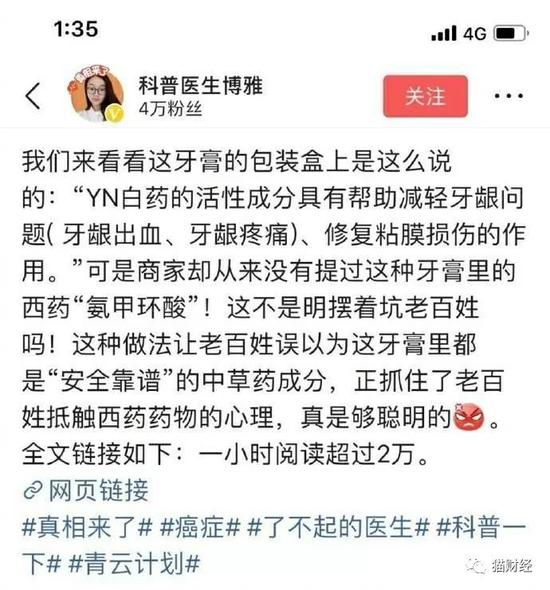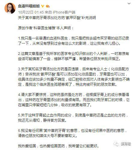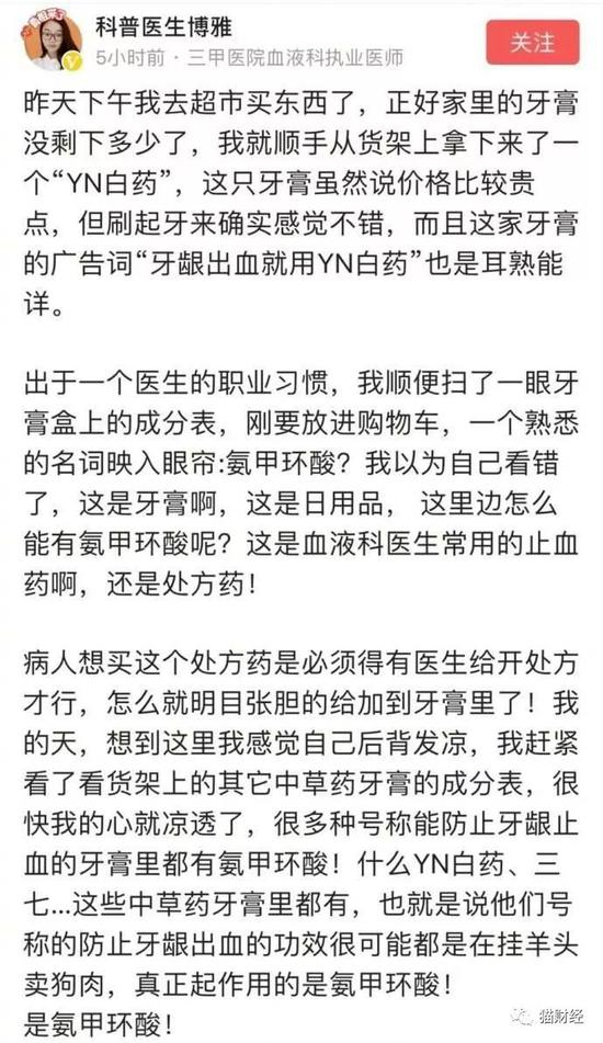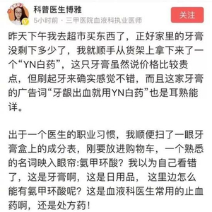文章一发出,便迅速引来舆论的广泛关注。尽管该科普医生事后也对文中的某些细节做了澄清,承认氨甲环酸可以被添加到化妆品,甚至牙膏中。但散开的风波却未能止住,甚至有网友发出质疑,“难道云南白药牙膏是中药负责宣传,西药负责效果?”