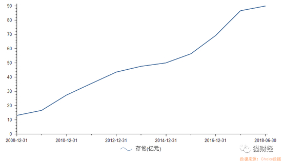 猫妹选取了云南白药十年的库存数据,如下图所示,2008年年末至2018年年中,其库存的期末余额(账面价值)由13.02亿元飙升至了89.9亿元。