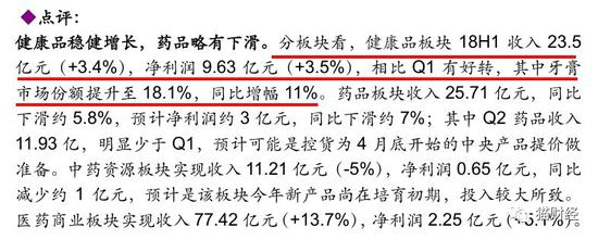 光大证券在对云南白药的半年报点评中称,分板块看,云南白药的健康品板块18H1 收入23.5亿元,净利润9.63 亿元。