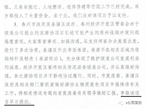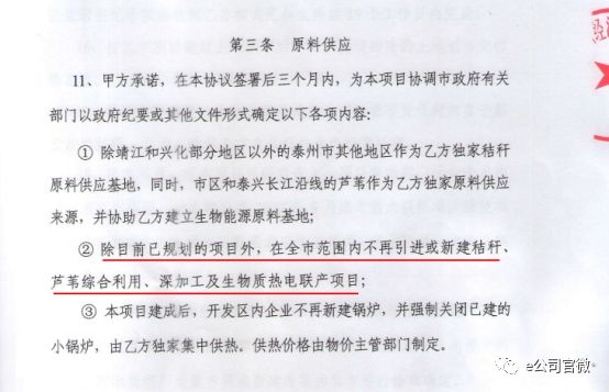 值得注意的是,该项协议的第三条与原料供应有关,并含有排他性条款,规定在全市范围内不再引进同类项目。相关条款载明,泰州市经济开发区管委会承诺,除靖江和兴化部分地区以外的泰州市其他地区作为联美中国独家秸秆原料供应基地,同时,市区和泰兴长江沿线的芦苇作为联美中国独家原料供应来源,将协助联美中国建立生物能源原料基地;除目前规划的项目外,在全市范围内不再引进或新建秸秆、芦苇综合利用、深加工及生物质热电联产项目;本项目建成后,开发区内企业不再新建锅炉,并强制关闭已建的小锅炉,由联美中国独家集中供热。