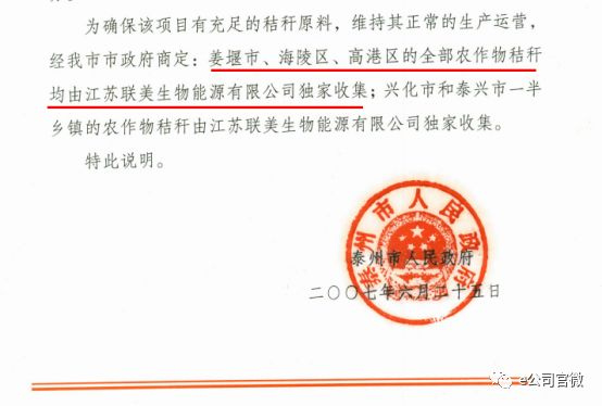 这份协议由泰州市人民政府作为见证方签订,半年后,2007年6月,泰州市人民政府出具了一则关于生物质热电工程项目原料来源的情况说明,文件指出,项目公司名称为江苏联美生物能源有限公司(即“江苏联美”),项目总装机容量36兆瓦,总投资约4.3亿元,项目建成后,将为泰州经济开发区、医药产业园及其周边楼宇提供集中供热服务。为保证该项目有充足的秸秆原料,市政府商定姜堰市、海陵区、高港区的全部农作物秸秆均由江苏联美独家收集,兴化市和泰兴市一半乡镇的农作物秸秆也由江苏联美独家收集。