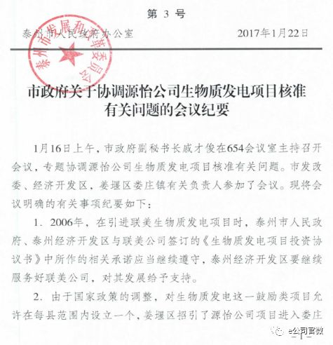 然而由于前述排他条款的存在,源怡股份在泰州的项目虽然在2015年就开工了,但进展并不顺利。2016年6月,泰州市经济开发区向时任市委书记蓝绍敏书面呈报《关于在泰州行政区域内不再批准重复建设生物质发电项目的报告》,蓝绍敏当时批示“生物质发电布点要严格按文件要求从严掌握”,并要求市发改委会同泰兴、姜堰区妥处。