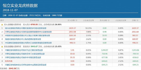 而在前一天,华泰证券深圳益田路荣超商务中心就曾位居恒立实业3日龙虎榜买一的位置,买入额为3826.14万元。