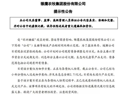 8日晚间,雏鹰农牧披露公告称,为了盘活库存、缓解公司目前现金流紧张的局面,公司计划对公司现有债务调整支付方式,本金主要以货币资金方式延期支付,利息部分主要以公司火腿、生态肉礼盒等产品支付,债务范围包括公司现有所有债务。已与小部分债权人达成初步意向,涉及本息总金额2.71亿元,目前尚未进行产品交割。