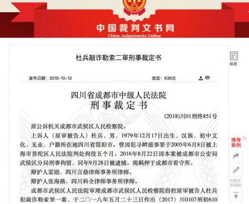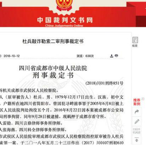 2018年9月27日的终审裁定显示,杜兵因敲诈勒索罪,判处有期徒刑十三年,罚金5万元;扣押电脑、硬盘等犯罪工具;将宝马X5汽车、冻结的存款40多万元还给红日药业;查封天府新区的房子,变现后扣除房贷,剩下的也还给红日药业;如果还不够数,责令杜兵退赔。