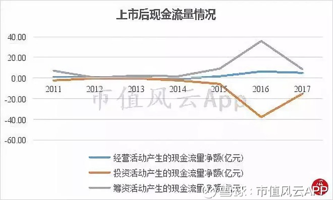 从上市后的现金流情况来看,捷成股份近年来投资力度十分大,2017年投资活动产生的现金流净额为-15.13亿;经营活动现金流净额仅有4.91亿,筹资活动现金流净额达到7.92亿。