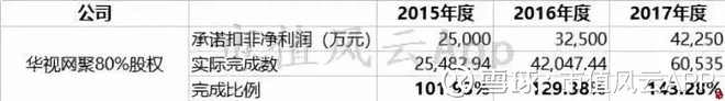 截至2015年6月30日,华视网聚净资产为2.78亿元,评估值为40.07亿,增值率1342.76%,身价一飞冲天。与之相对应的是高业绩承诺,来看看这几年业绩完成情况,比前几家公司表现好一些。