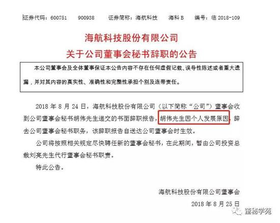 2018年8月25日,海航科技董秘胡伟以“因个人发展原因”辞去董秘职务。