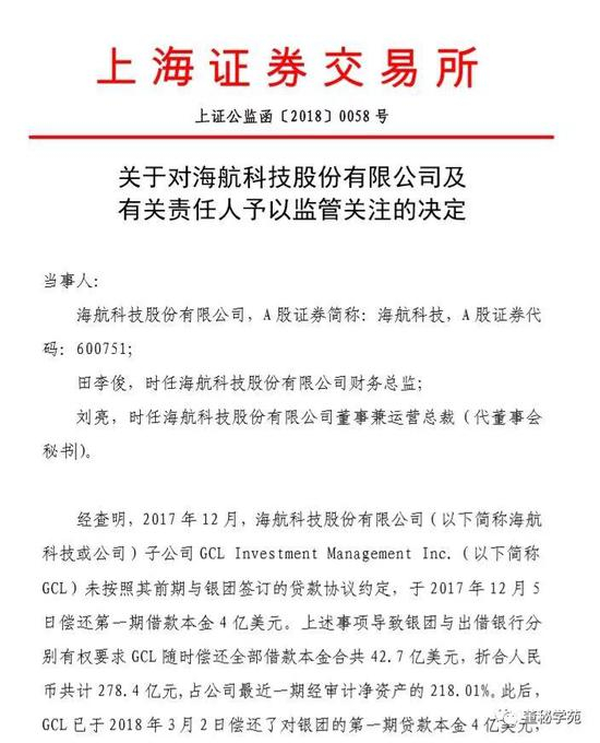 据上交所监管函,经查明,2017年12月,海航科技子公司GCL未按照其前期与银团签订的贷款协议约定,于2017年12月5日偿还第一期借款本金4亿美元。