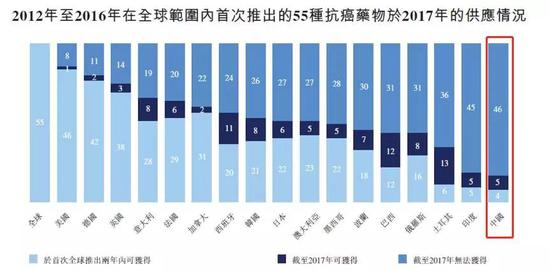 公司专注于单抗药物的研发。根据公司公开资料,当前中国单抗药物市场仅占全部药物市场的5.3%,而全球的这一比例达到了43.2%。由下图所示,在2012年至2016年全球推出的55种新肿瘤药物中,截至2017年仅有9种可在中国获得,大幅低于全球主要国家。