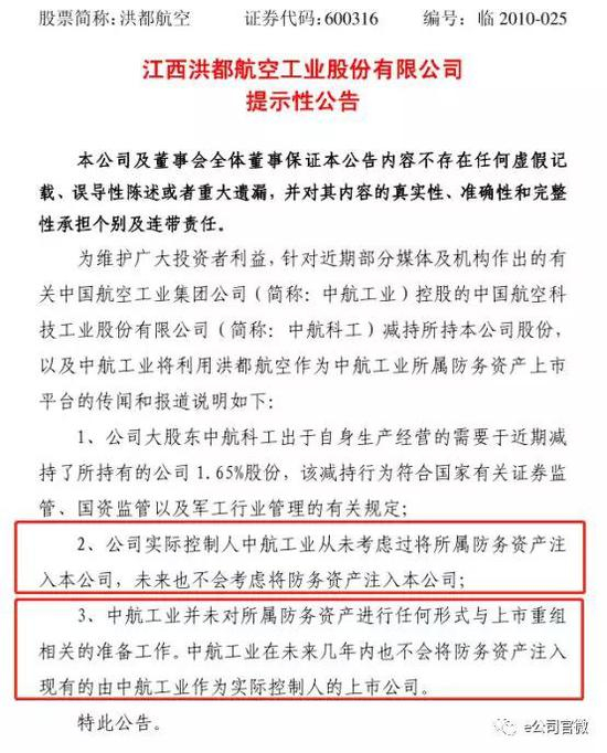 中航工业在这份公告中表示,从未考虑过将所属防务资产注入洪都航空,未来也不会考虑将防务资产注入洪都航空。同时还强调未对所属防务资产进行任何形式与上市重组相关的准备工作,中航工业在未来几年内也不会将防务资产注入现有的由中航工业作为实际控制人的上市公司。