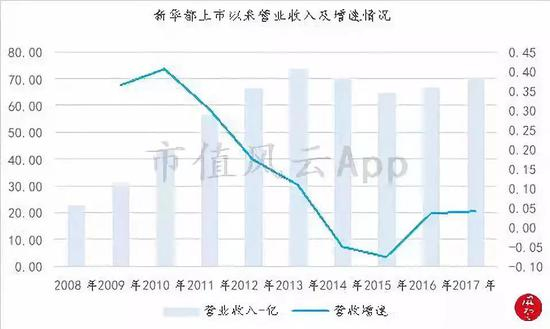 风云君选取了上市以来的业绩数据,可知伴随着行业营收增速总体下滑的情况,新华都近年来最高的营收都只是在70亿左右徘徊,2013年公司营业收入达到上市10年来的顶峰——73.8亿。但是从2014年开始,公司的营收规模就开始下降。2016年、2017年伴随着外延并购、线下零售的复苏,营收有小幅增长。
