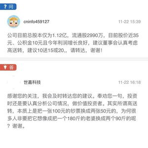 11月22日,当投资者问到世嘉科技董秘“公司目前总股本仅为1.12亿,流通股2990万,目前股价近35元、公积金10元且今年利润增长良好,建议董事会认真考虑高送转,建议10送15或20,,请转达,谢谢!”