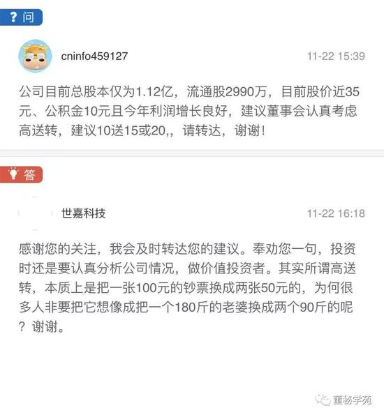 世嘉科技董秘姚跃文的回复则非常的诚恳,“感谢您的关注,我会及时转达您的建议。奉劝您一句,投资时还是要认真分析公司情况,做价值投资者。其实所谓高送转,本质上是把一张100元的钞票换成两张50元的,为何很多人非要把它想像成把一个180斤的老婆换成两个90斤的呢?谢谢。”