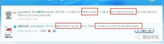 其实,世嘉科技董秘耿直不是一次了,11月13日,科创板这个词出来之后,也成为一个和雄安一样火的概念,就有投资者问公司,“上交所要推科创板,公司是否有科创方面的业务或投资,是否会响应国家号召开展科创业务支持科创板块发展!”