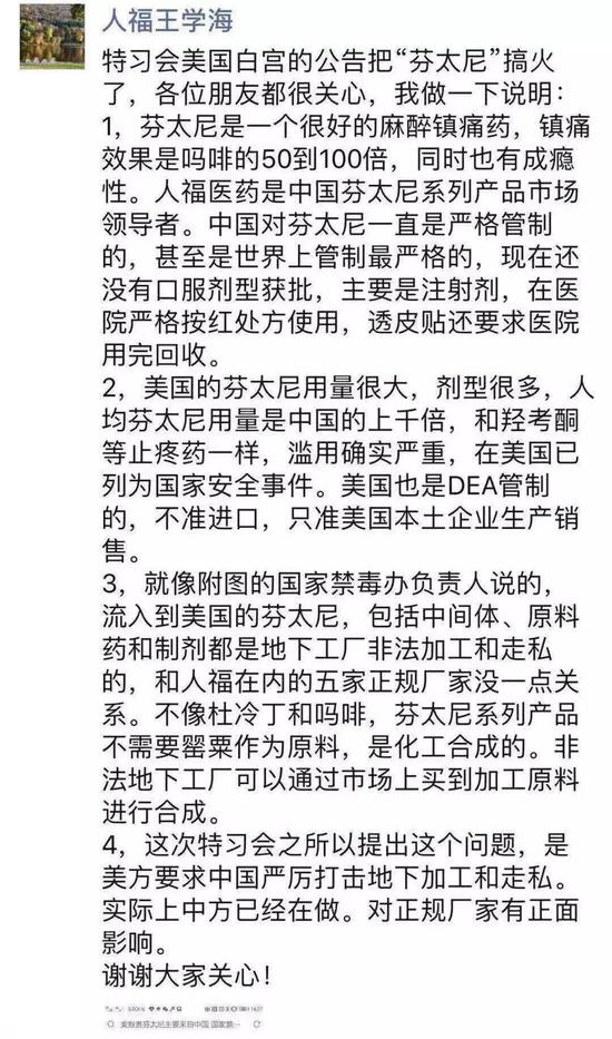 人福医药董事长王学海也在朋友圈做出回应,否认芬太尼出口到美国。王学海称芬太尼是一个很好的麻醉镇痛药,同时也有成瘾性。中国对芬太尼一直是严格管制的,甚至是世界上管制最严格的,现在还没有口服剂型获批,主要是注射剂,在医院严格按红处方使用。