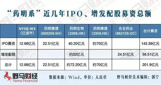 据野马财经(微信公号:ymcj8686)不完全统计,截至目前,“药明系”旗下公司IPO募资、增发配股的总额已近人民币200亿元。