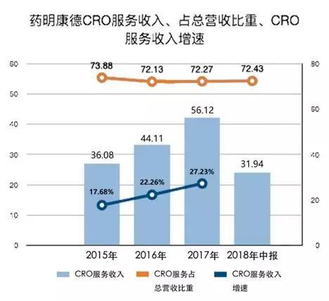 其中,CRO收入占总营收的比重在70%以上。而据Wind数据显示,药明康德2015年-2017年CRO服务收入的增速在逐年加快,2017年增速达到27.23%,超过同期全球同行业10.3%的复合年增长率。
