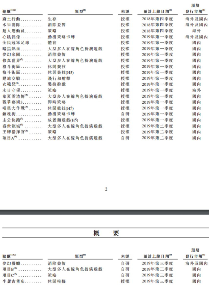 在新游戏储备方面,目前公司储备有25款游戏预期将于2018年及2019年上线,但还有多个游戏并没有拿到具体的版号。其中,仅有于国内推出的7款游戏已取得国家新闻出版广电总局的前置审批。以下为公司储备游戏情况: