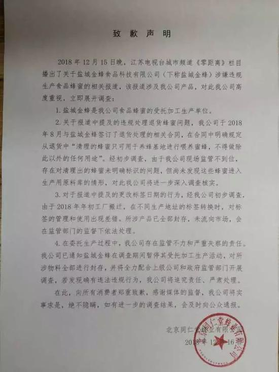 今天(12月16日)上午,针对生产企业回收过期蜂蜜一事,北京同仁堂发布致歉声明: